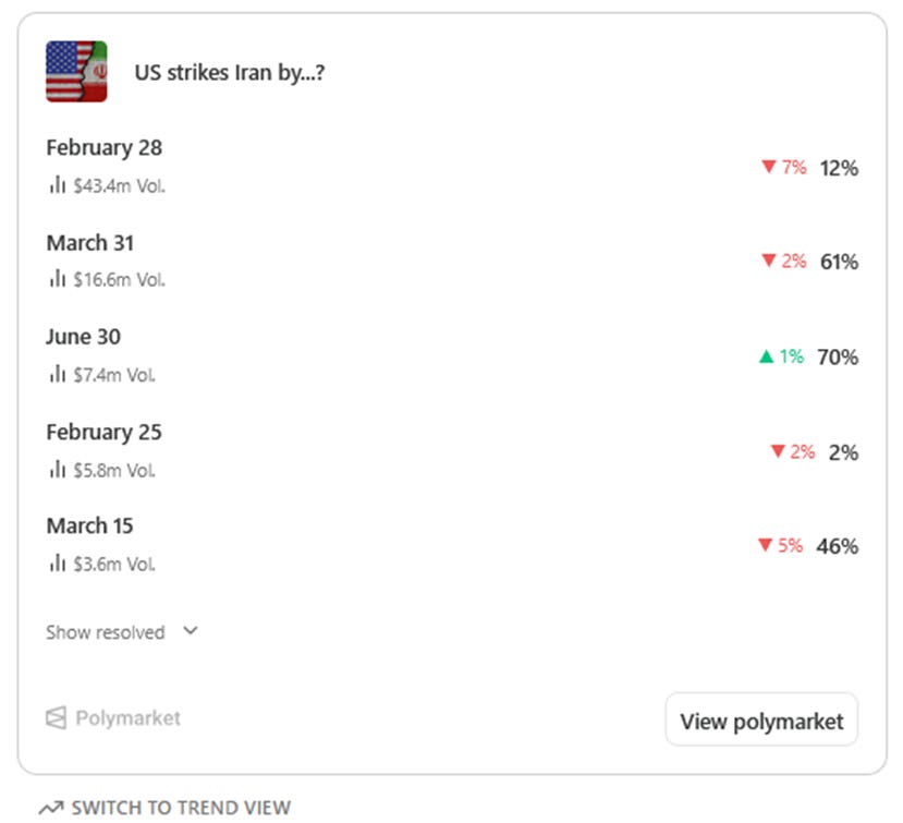 But, friends, prediction markets are not markets. The very term itself was devised by a marketing firm and voted on in a boardroom from a short list of phrases to best trick the target demographic into thinking this is not gambling. Polymarket and their competitors came up with the term “prediction market” specifically to dodge gambling laws. It’s not some new buzzy Silicon Valley tech concept. That’s why they did it.