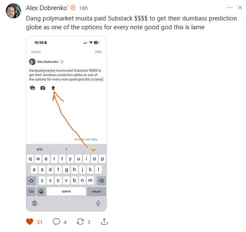 And just to be clear—literally everybody hates this. Everybody. You can even drop a gambling link in a post on Substack’s microblogging social feed, Notes. There’s a button right there. There are people in recovery from legitimate serious addictions who are going to have to avoid the site now in case someone slips a Polymarket link in their feed like a roofie. I haven’t seen a single person who likes or wants this. Alex Dobrenko hates this. Alex Dobrenko` is practically the mascot of the website. This is like Mickey Mouse calling Bob Iger a fucking dumbass.
